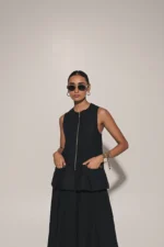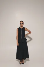 Black front zipper sleeveless jacket with box pleated skirt