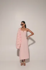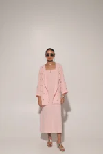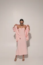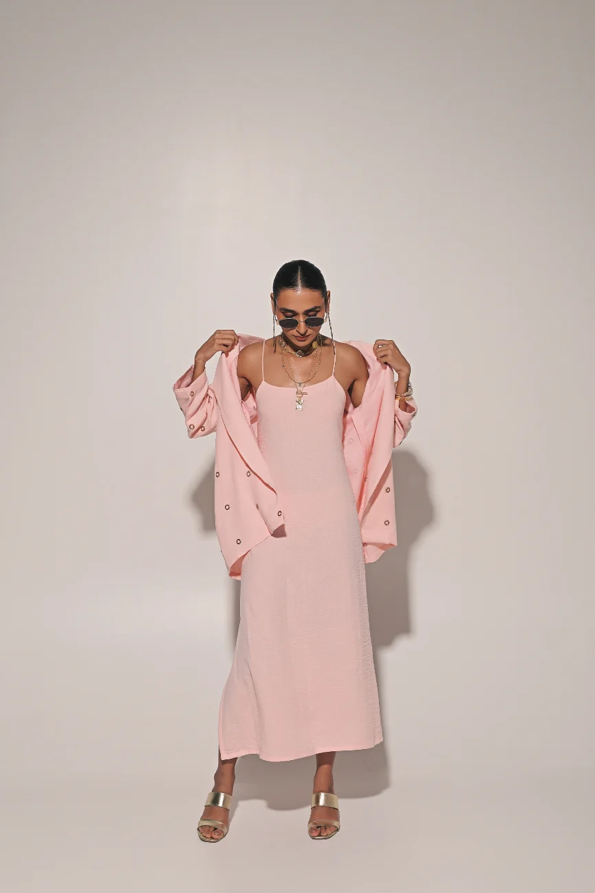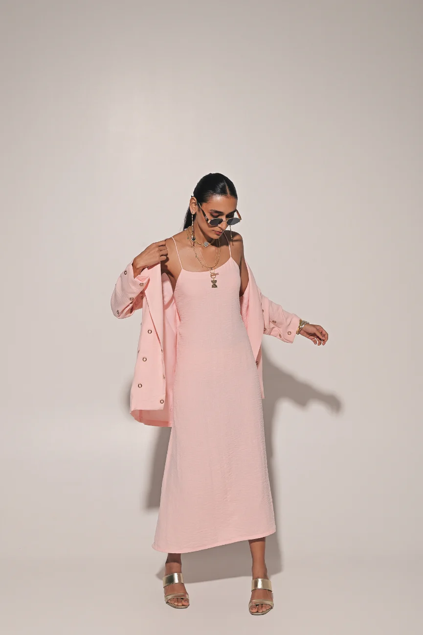 Peach strap long dress with metal embedded overlay jacket