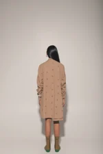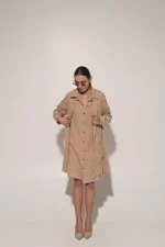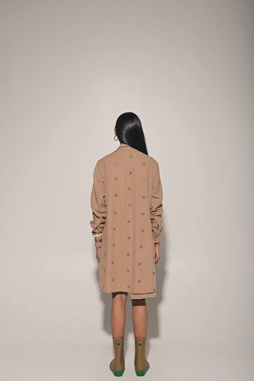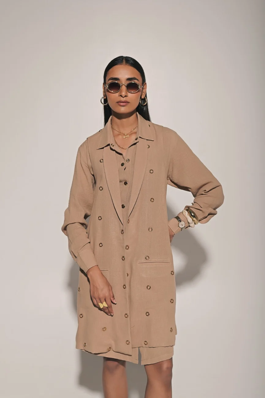 Beige front button shirt dress with metal ring embedded jacket