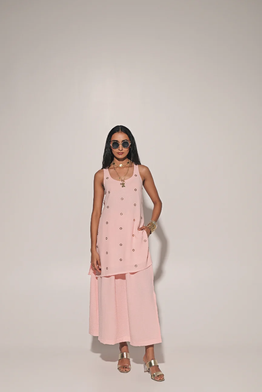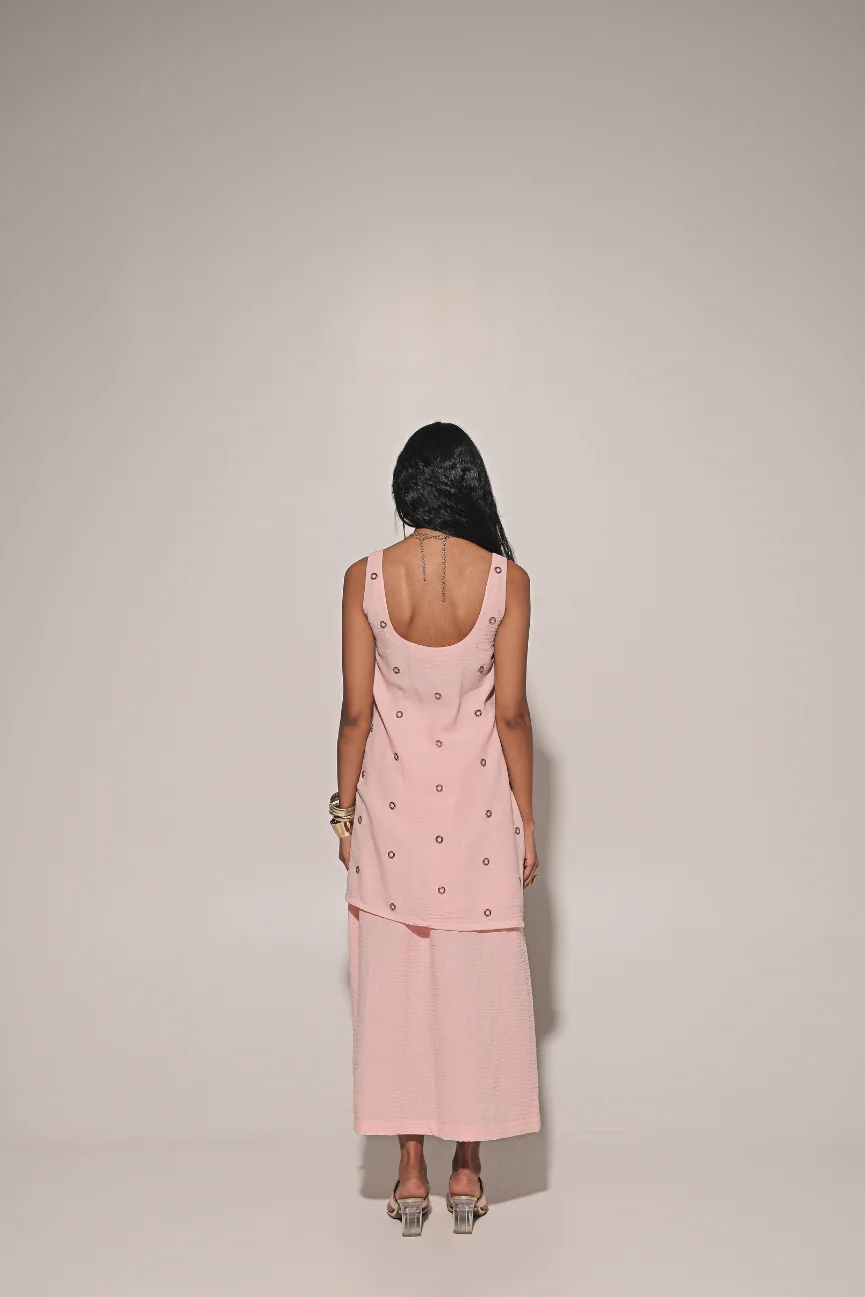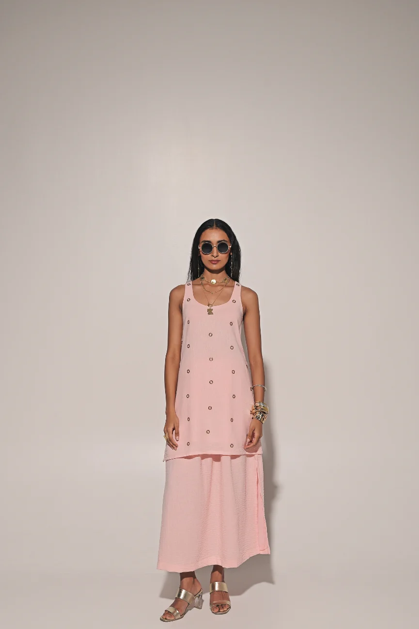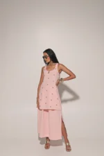 Peach sleeve long blouse with side slit skirt