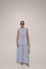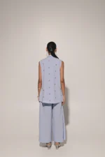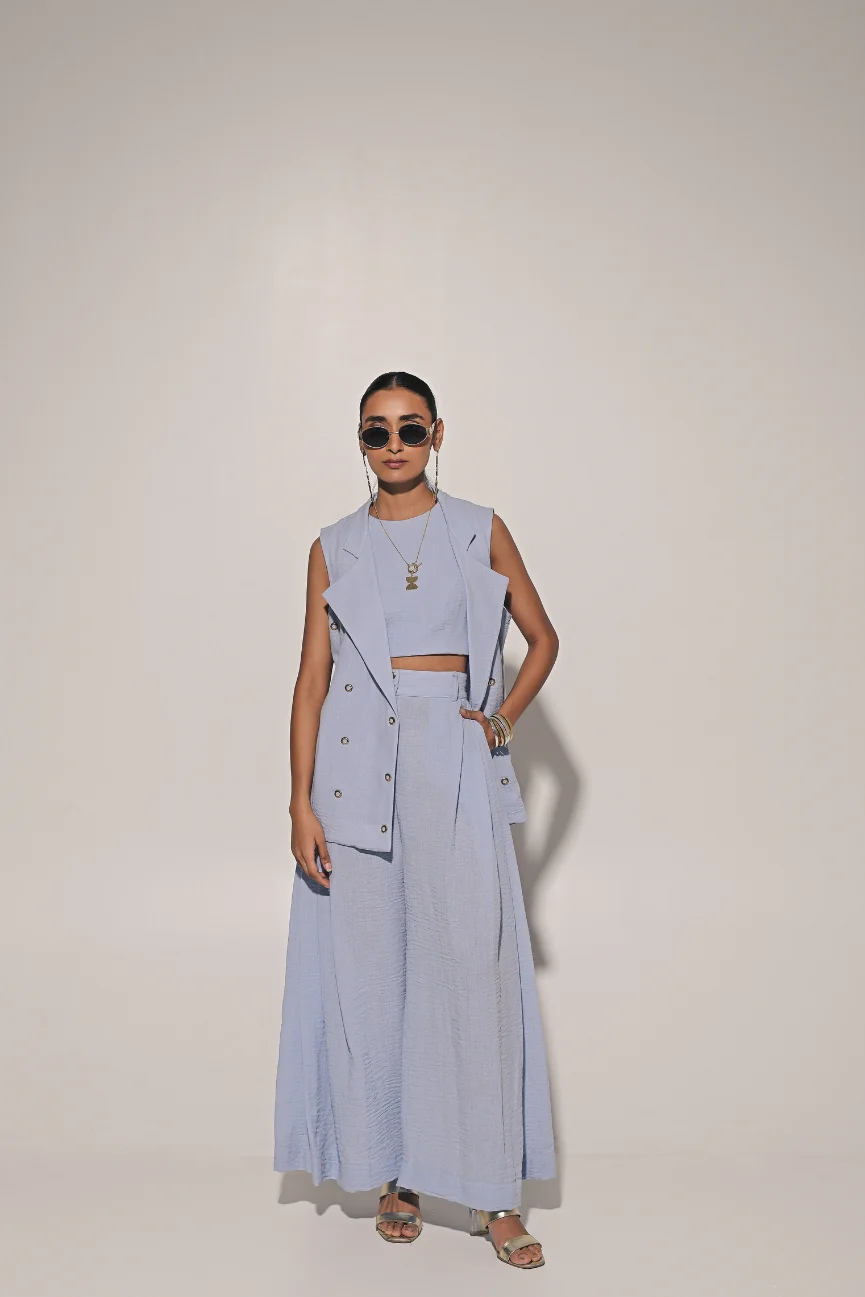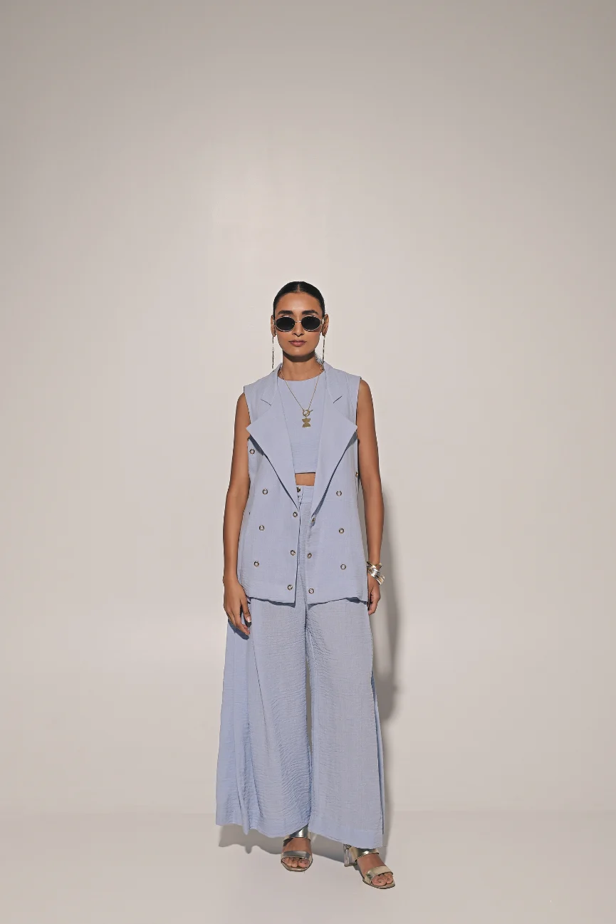 Blue metal ring embedded jacket with crop top and flared pants